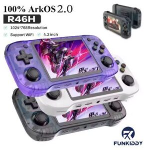 Consola portátil R46h con pantalla IPS de 4 pulgadas, sistema Linux RK3326, 64G, etc. Disponible en varios colores, como su hermana r36h pero más grande.
